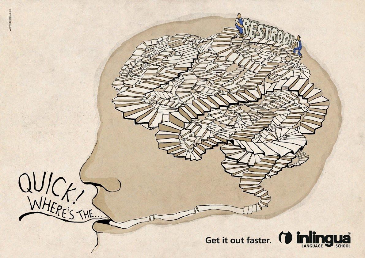 Ti manca la parola? Magari è proprio lì, più che sulla punta della lingua nascosta tra le sinapsi e non proprio archiviata sotto la cartella “lingua inglese”. La soluzione di Inlingua per pubblicizzare i propri corsi di lingua, un po' Escher un po' Settimana Enigmistica, ma molto efficace.