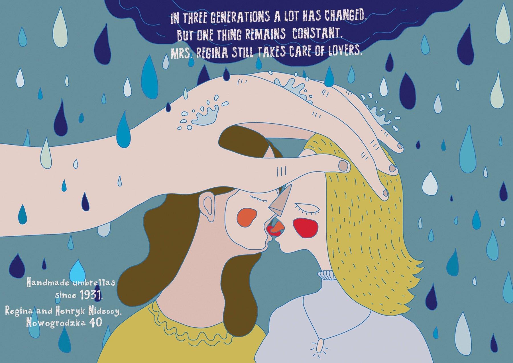 Dal 1936, Regina e Hernryk Nideccy si occupano di ombrelli fatti a mano. Ne è passata di acqua sopra gli ombrelli, mentre sotto le cose sono davvero cambiate! Una soluzione davvero creativa che riprende il plus di prodotto senza annoiarci.