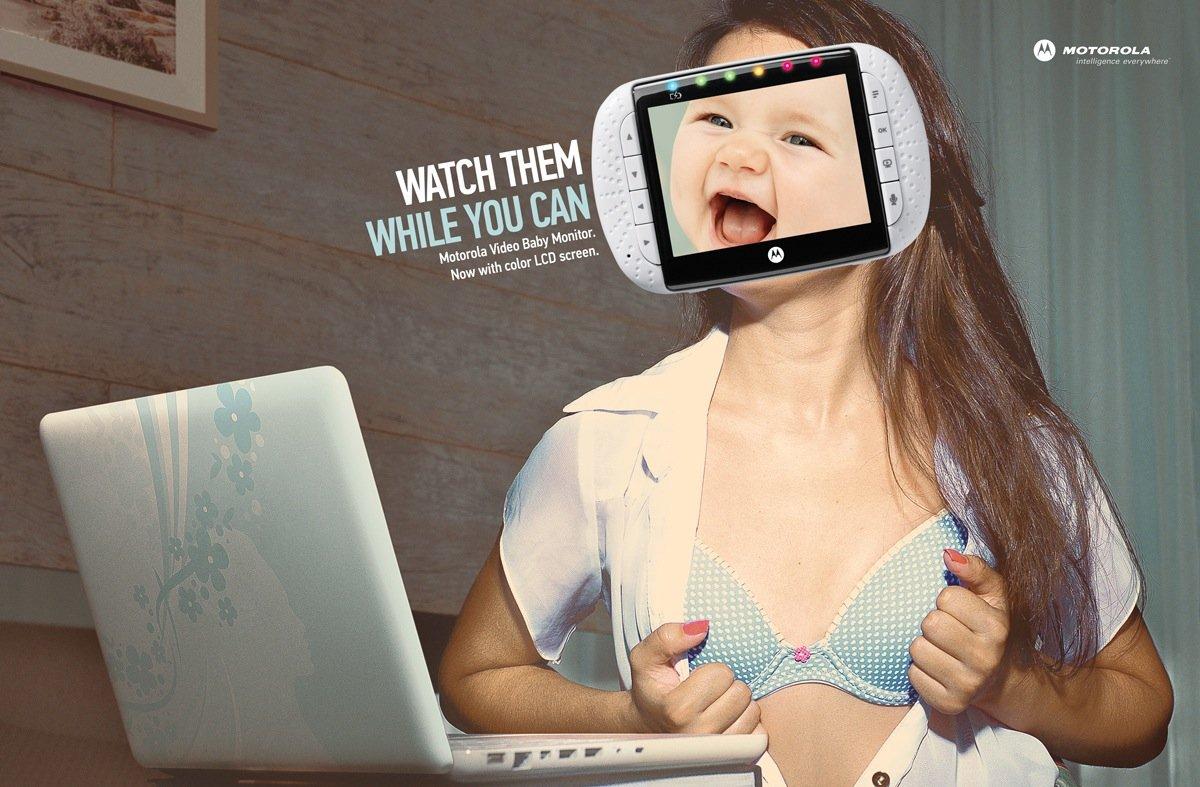 "Guardali finchè sei ancora in tempo". Molto originale la serie di annunci stampa realizzati dall’agenzia brasiliana Revolution per Motorola. Il nuovo Video Baby Monitor con tecnologia LCD permette ai consumatori di sfruttare tutte le potenzialità di uno schermo in un piccolo spazio. Il Baby Monitor permette ai genitori di ascoltare e vedere, con una telecamera ad infrarossi, il proprio bambino anche di notte.