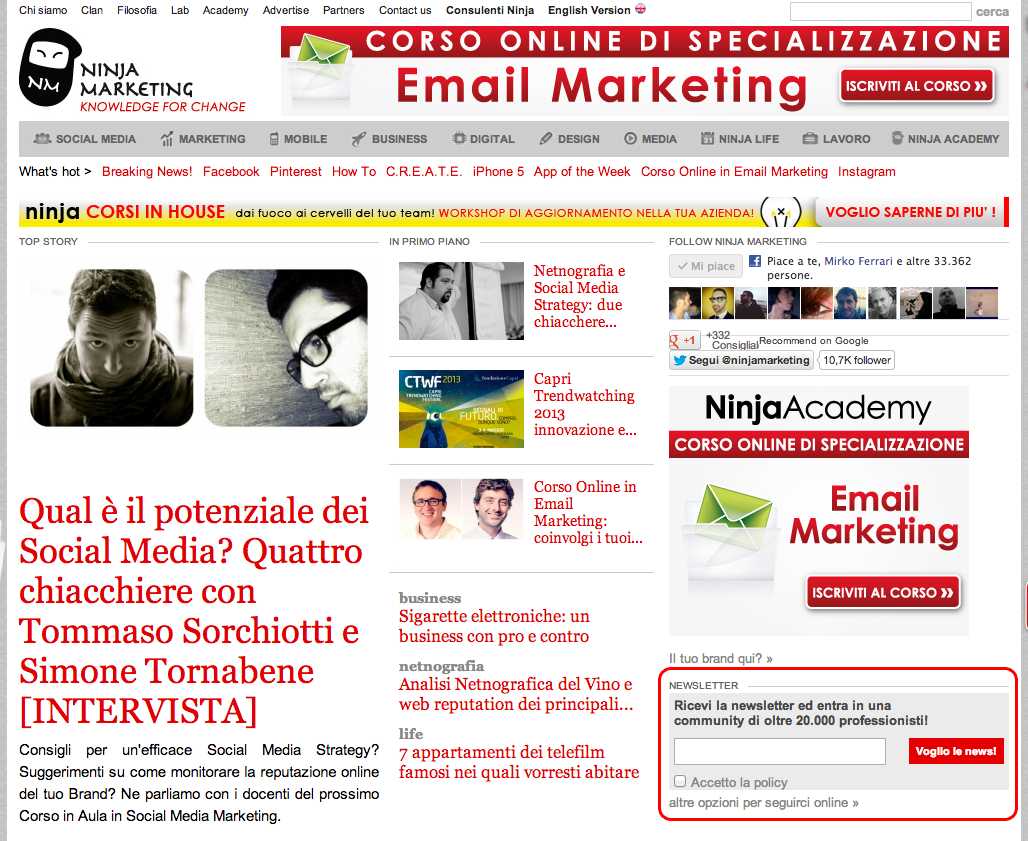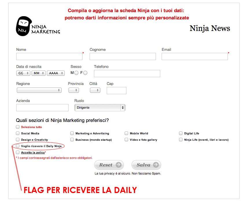 Per questo da lunedi, tutti gli iscritti alla Newsletter di Ninja Marketing riceveranno nella loro mail una selezione dei migliori post di Ninja Marketing: l'abbiamo chiamata Daily Ninja e speriamo possa essere per voi un servizio utile per restare sempre aggiornati sulle novità in campo Social Media, Marketing, Business, Creatività e su tutti gli altri temi che affrontiamo quotidianamente.
