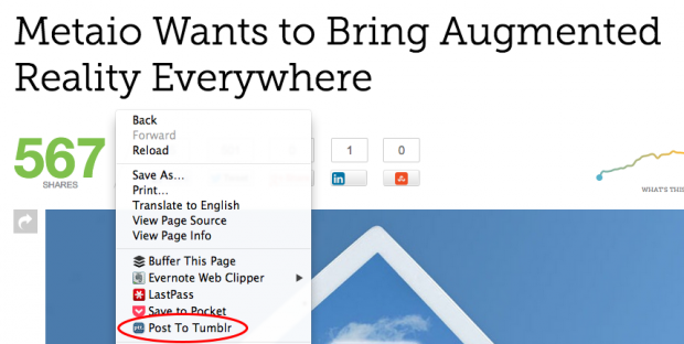 Se durante la navigazione incontriamo qualcosa degno di essere condiviso con il nostro audience su Tumblr, questa estensione (che utilizzeremo semplicemente dal tasto destro) ci consente di condividerlo con un clilk.