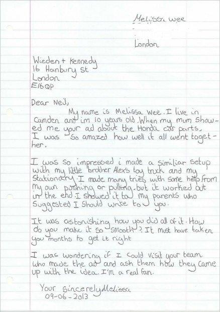 Wieden+Kennedy di Londra ha pubblicato alcuni giorni fa sul suo sito un post dedicato ad una corrispondenza assai particolare: una lettera da parte di una bimba di nome Melissa che ha contattato i creativi per complimentarsi per lo spot Cog realizzato per Honda nel lontano 2003!