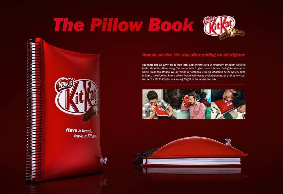 I giovani studenti universitari si svegliano presto per frequentare i corsi, e vanno a letto tardi per divertirsi con gli amici. Kit Kat ha pensato bene di dare vita ad un taccuino gonfiabile brandizzato. Durante il giorno potrete annotare tutte le nozioni importanti apprese durante le lezioni, e di notte avrete modo di prendervi una pausa e rilassarvi mangiando un ottimo kit kat con il vostro libro gonfiabile che si trasforma in cuscino. Come influenzare il target giovanile in maniera innovativa: imparate da JWT Brazil.