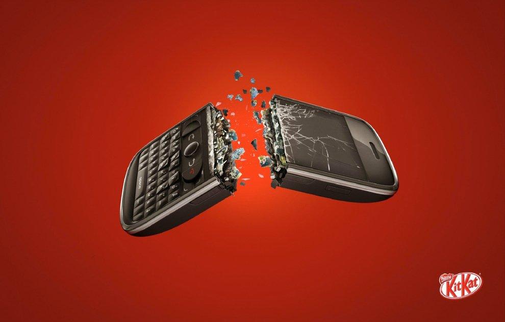 Un’immagine di grande impatto che rappresenta ciò che bisogna fare per prendersi una pausa. “Spezza” il tuo cellulare, interrompi la tua riunione di lavoro e goditi un momento solo per te con Kit Kat.