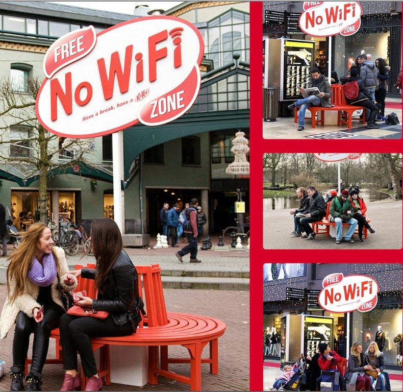 Il mondo sta diventando una grande rete WiFi. E’ disponibile in bar, ristoranti, aeroporti, supermercati. Risultato? Le persone sono costantemente online. Ed il tempo per una pausa? Nel centro di Amsterdam l’agenzia pubblicitaria JWT ha creato una zona libera da wi-fi in un raggio di 5 metri bloccando tutti i segnali. Niente e mail, niente aggiornamenti di facebook o tag, tutti hanno potuto leggere un giornale o un libro e gustare un Kit Kat per un momento di pausa, reale.