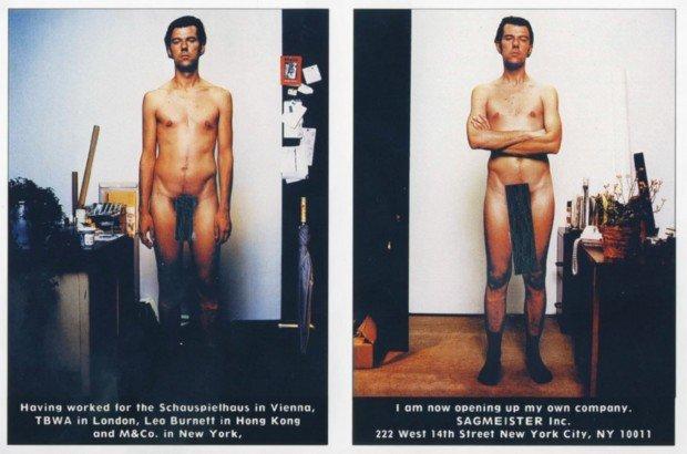 Diciannove anni fa Stefan Sagmeister decide di lasciare il lavoro di designer che svolgeva presso grandi agenzie creative come Leo Burnett e TBWA per dar vita alla sua piccola creatura, la Sagmeister Inc. Per avere un po’ di visibilità decise di inviare in giro una foto di lui completamente nudo, ad eccezion fatta per i calzini e una pecetta nera messa proprio lì dove pensate voi.