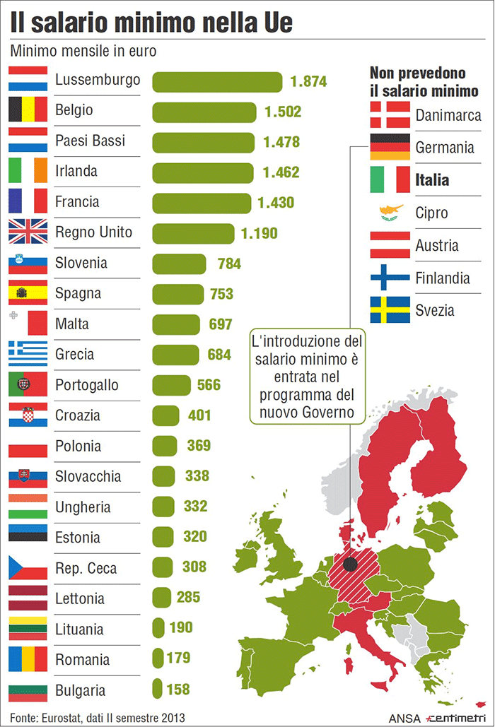 Questi stipendi cambiano molto a seconda dello Stato: si passa da importi lordi di 157 euro in Romania a 1.462 in Irlanda, fino ai 1.874 euro in Lussemburgo, che comprendono anche le imposte sul reddito e i contributi in sicurezza sociale.