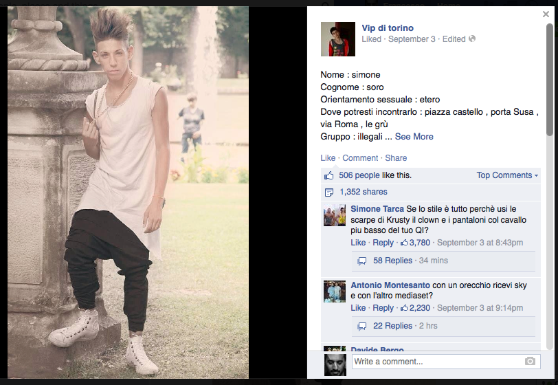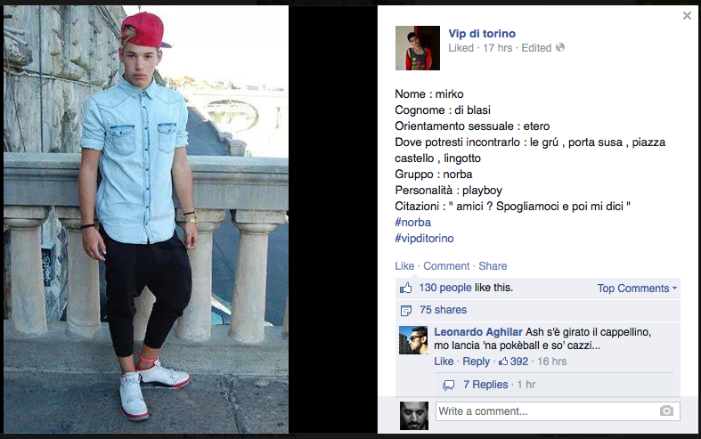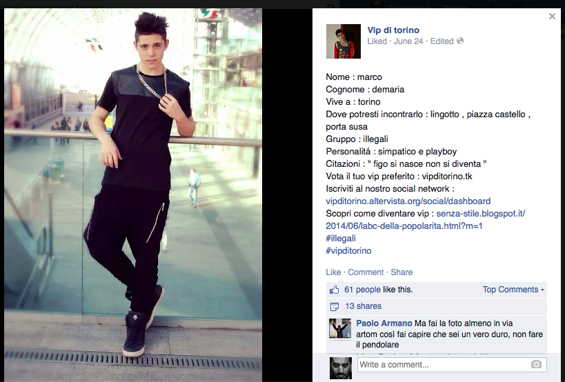 Uno spazio specifico sul social network più popoloso, dove da diversi mesi, a fase alterne, anonimi web master condividono foto e "schede tecniche" di alcuni gruppi di giovani torinesi, i quali si fregiano di titolo di Vip nonostante la giovane età.