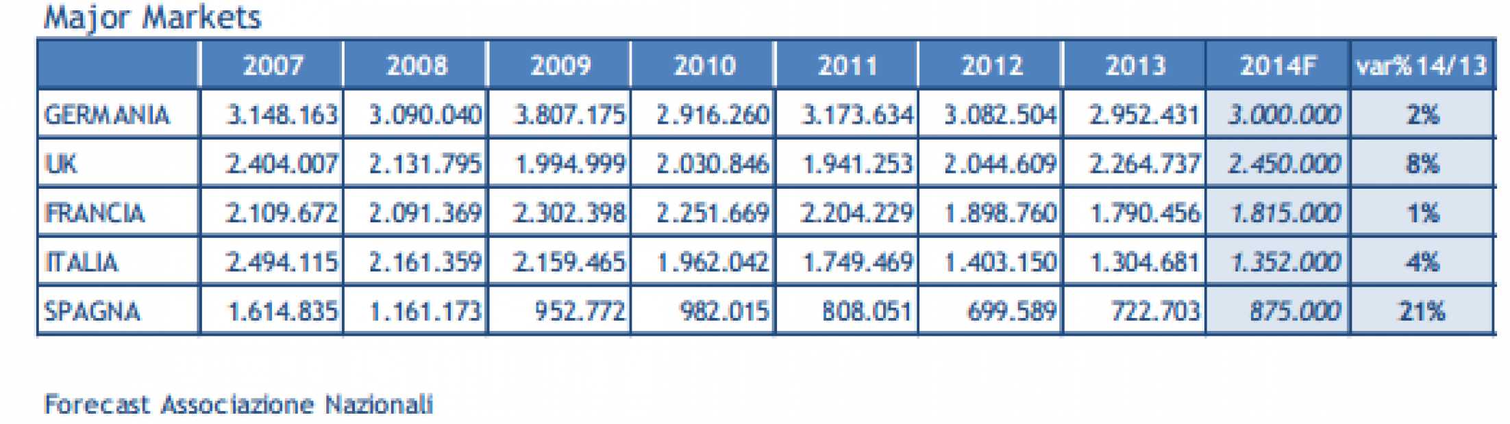 In Italia, a luglio e ad agosto 2014, sono state immatricolate rispettivamente 114.343 (+5,5%) e 53.191 (-0,2%) autovetture, che portano il consuntivo dei primi 8 mesi a poco più di 925 mila unità, con un incremento che scende al 3,5%, dal 6,1% di gennaio-marzo.