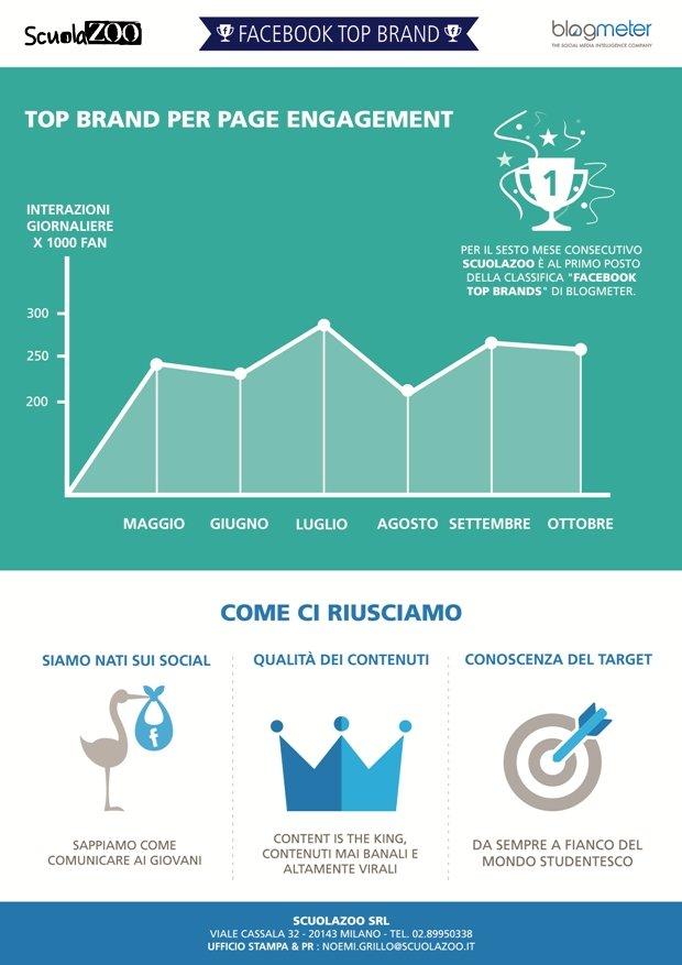 Con un panel di riferimento delle Top Brands composto da più di 3.000 pagine Facebook italiane, ScuolaZoo ottiene, infatti, una media giornaliera di 256,9 attività degli utenti sulla pagina Facebook per ogni 1.000 fan e 120.560 commenti/post unici in un mese.