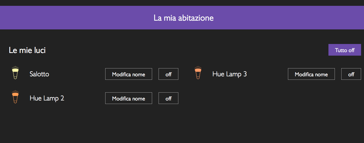 Una library molto ricca di "scene", che fanno cambiare alla lampadina croma e intensità. Dal viola al giallo, all'azzurro fino al bianco: grazie al cursore del dashboard, posso regolarne il tono, così da ottenere sfumature non settate.