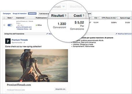 Dopo aver creato l'inserzione, si potranno vedere le colonne adeguate nella visualizzazione "Inserzioni" in "Gestione inserzioni" per monitorare le conversioni, inclusi i risultati (le conversioni ricevute) e il costo (il costo per conversione).