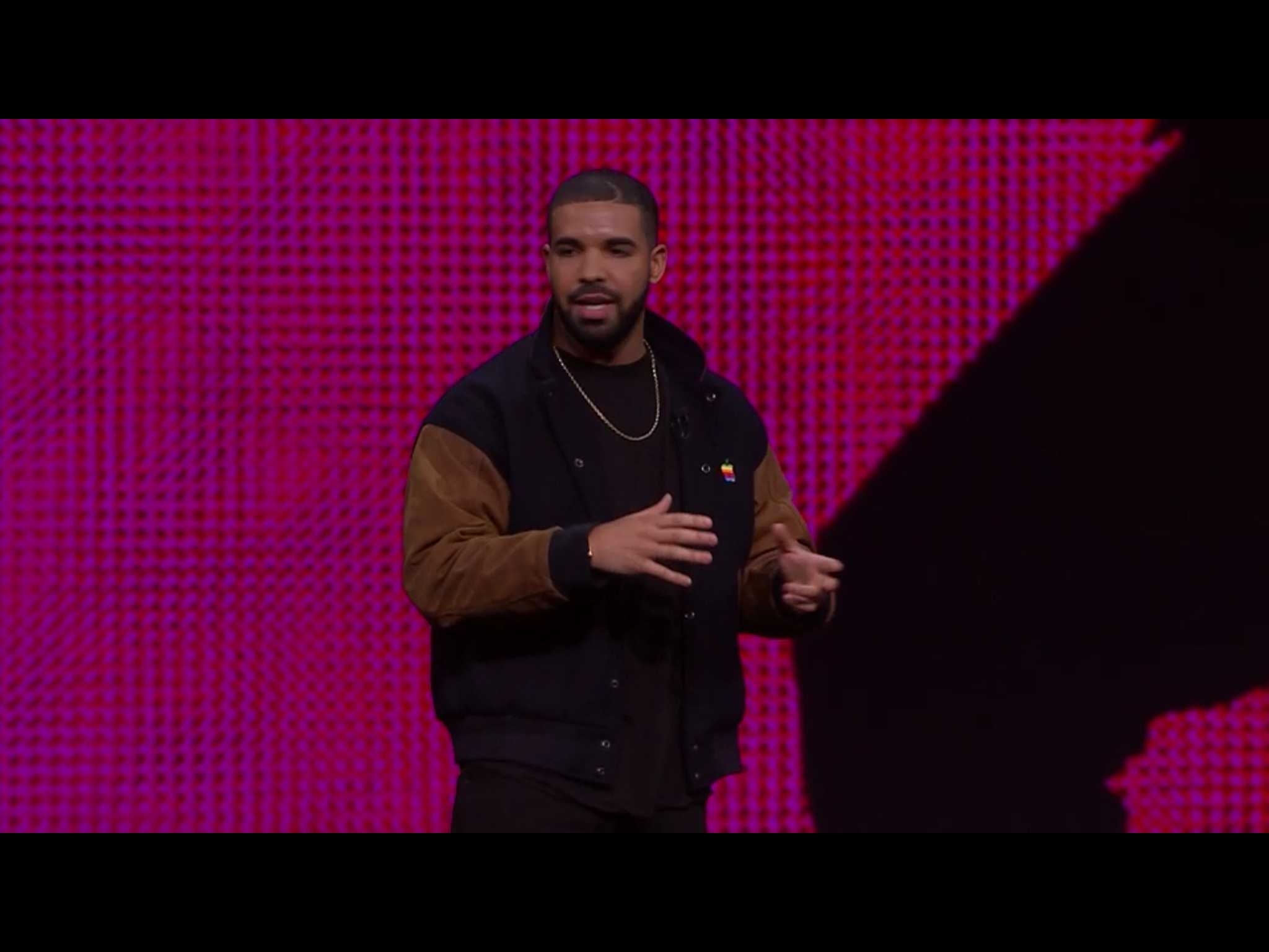 Sale sul palco Drake. il dj che già da qualche giorno di mormorava fosse stato arruolato per Music: Drake ci racconta la sua testimonianza su come la tecnologia ha cambiato la sua vita... Una piccola curiosità: avete notato il vecchio logo Apple sul suo giubbotto?