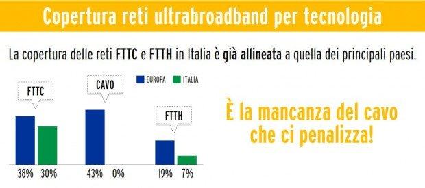 Se la copertura delle reti FTTC (Fiber to the cabinet) in Italia è di tutto rispetto a confronto con la media europea, la mancanza del cavo penalizza la diffusione dell'ultrabroadband; la presenza delle reti FTTH (Fiber to the home) nel nostro Paese è però allineata con il resto dell'Europa.