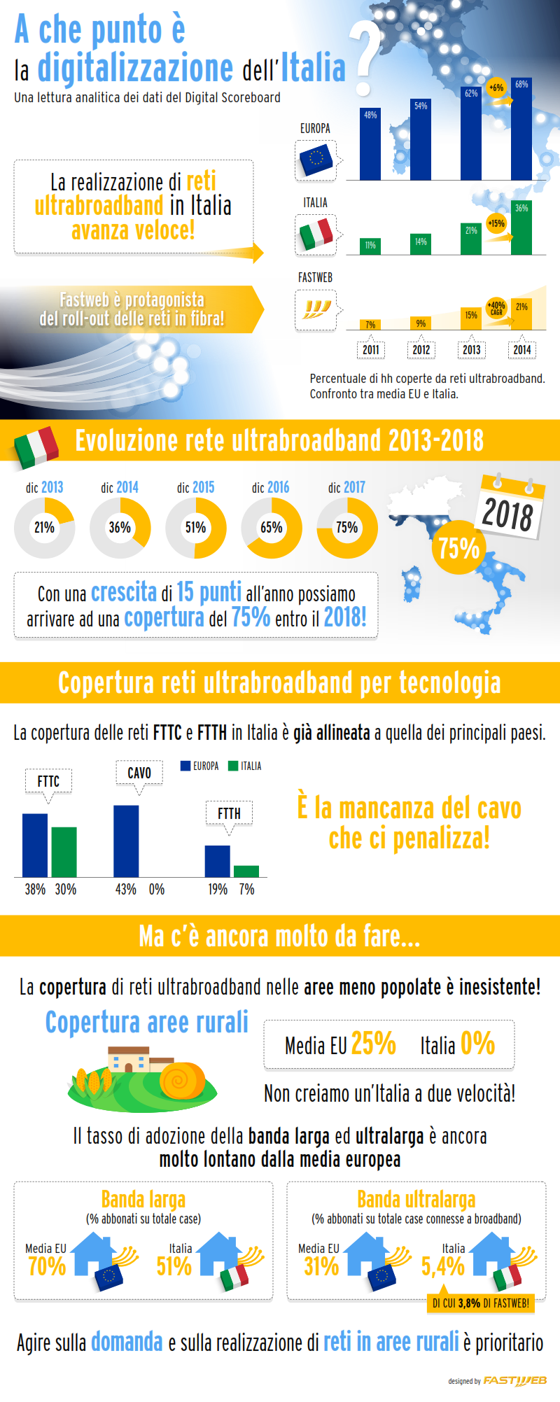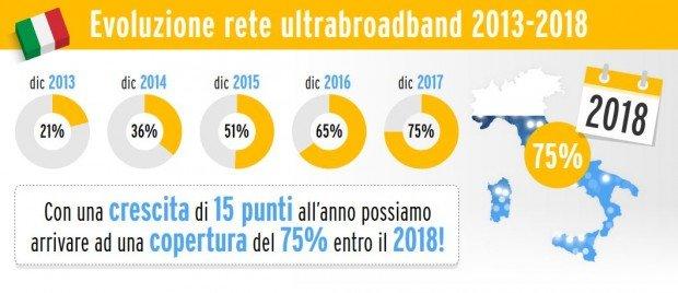 Da dicembre 2013 a dicembre 2014 l'evoluzione della rete ultrabroadband in Italia è passata dal 21% al 36%; secondo l'infrografica di Fastweb, però, entro la fine del 2015 si arriverà al 51% di diffusione e con una crescita di 15 punti all'anno. Entro il 2018 si potrà arrivare a una copertura del 75% del territorio.