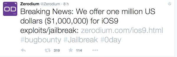 E dal momento che il tema "sicurezza" con iOS9 sembra essere diventato molto caldo, c'è chi ha pensato bene di mettere "un premio da 1 milione di dollari" per i primi che riusciranno a realizzare il jailbreak di iOS9: si tratta di Zerodium, specializzata nello sviluppo di tecniche di intrusione informatica, che raccoglie una community di ricercatori e che vende i suoi programmi poi anche ad agenzie governative.