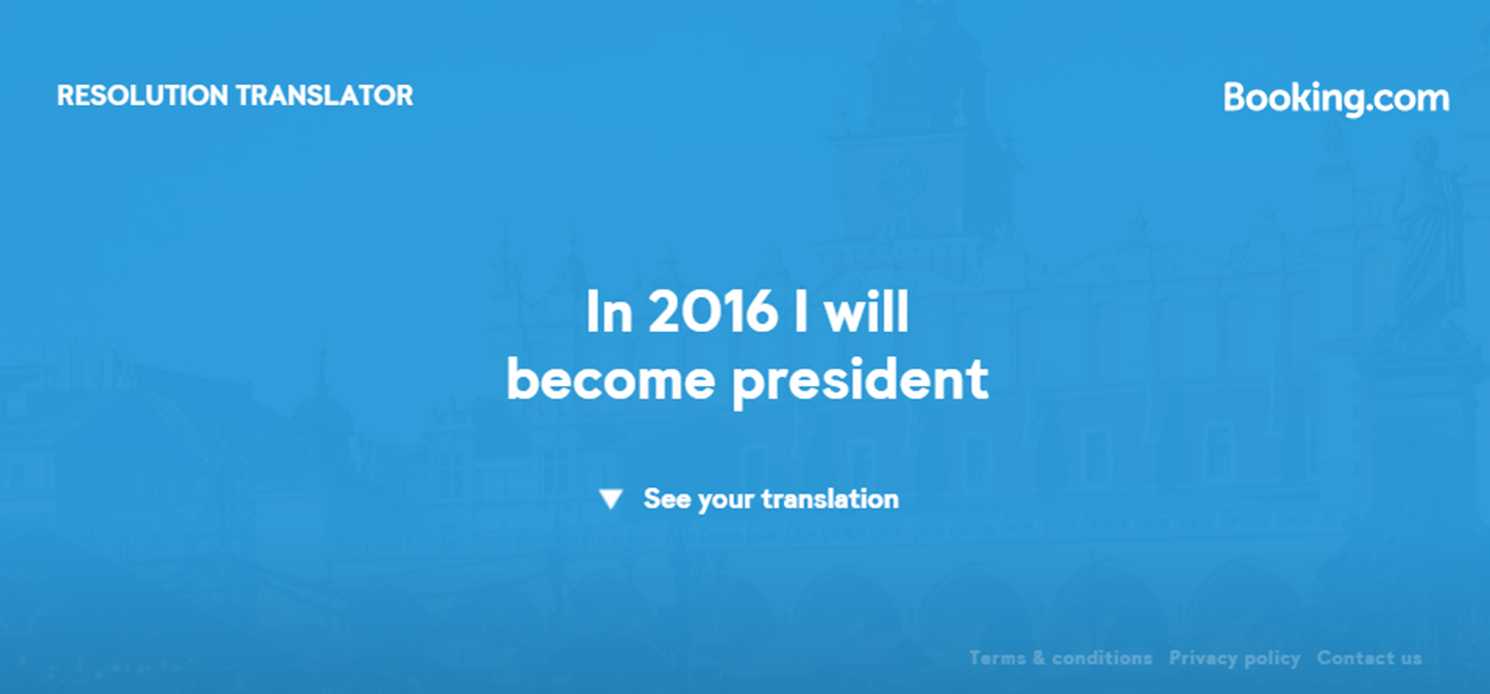 Resolution Translator nasce da un’idea di Booking.com, in collaborazione con l’agenzia pubblicitaria, Weiden + Kennedy Amsterdam. La campagna è un modo divertente per scoprire nuove destinazioni, aiutando le persone a rispettare i buoni propositi, spesso abbandonati nel corso dei mesi.