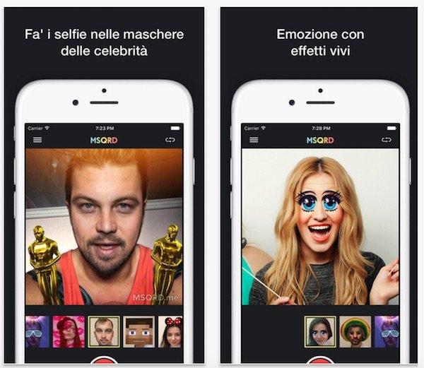Di cosa si tratta? Di un'altra app per realizzare video animazioni in stile GIF, che utilizza però in questo caso il riconoscimento facciale del tuo volto. Infatti MSQRD, acronimo di MASQUERADE, riesce a riprodurre una maschera virtuale sul tuo viso e ti permette in questo modo di girare video selfie divertenti in cui puoi di volta in volta assumere le sembianze di un animale, di un cartone animato o di un altro dei tanti filtri della sua libreria.