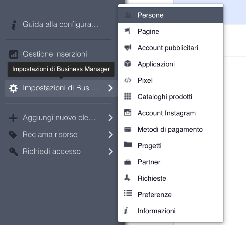 Si ricordi che una risorsa in Facebook Business Manager può essere una persona, una pagina, un account pubblicitario o un catalogo prodotti.