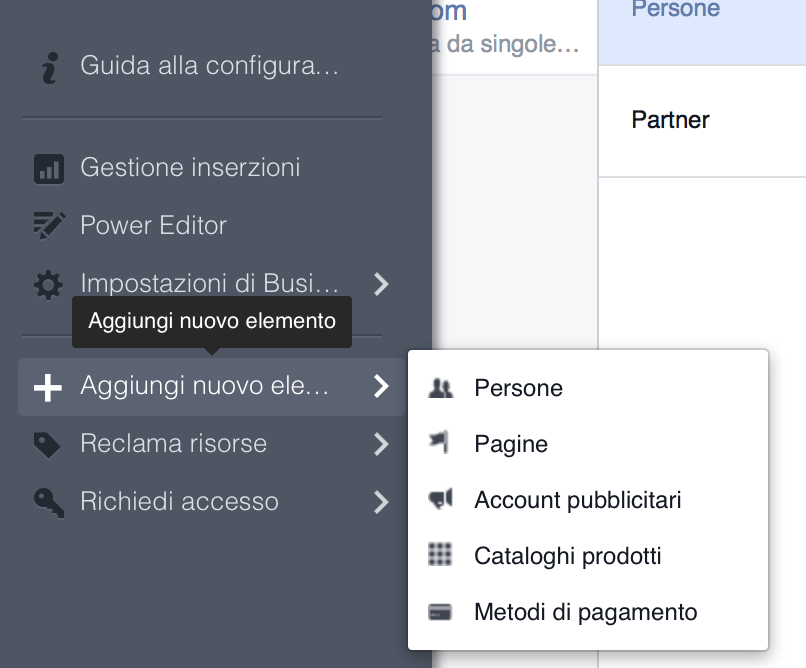 Per vedere l’elenco dei partner con cui lavorate, quali siano le risorse che gestiscono e, se necessario, rimuoverli, selezionate impostazioni di business manager —> partner.