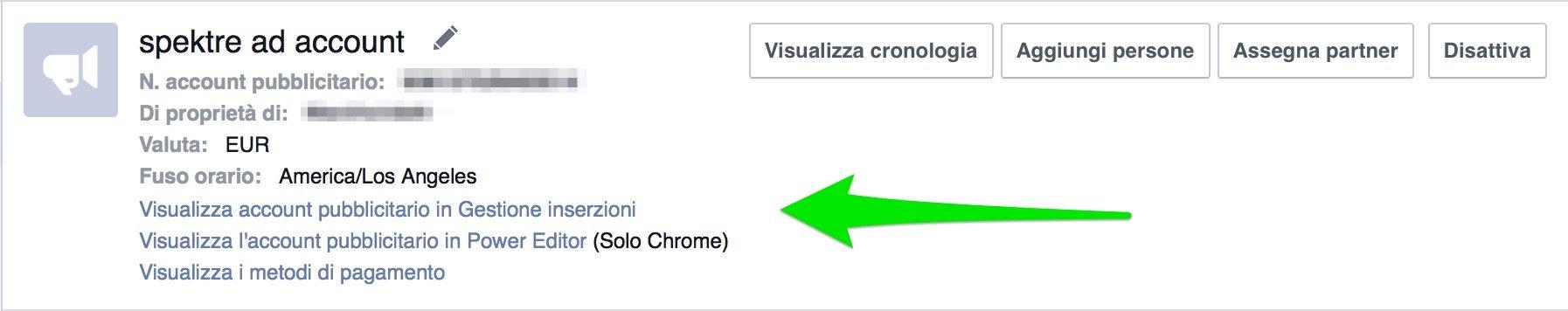 Se desiderate creare annunci, o gestire i metodi di pagamento per l’account selezionato, è sufficiente cliccare sui link indicati in figura dalla freccia.