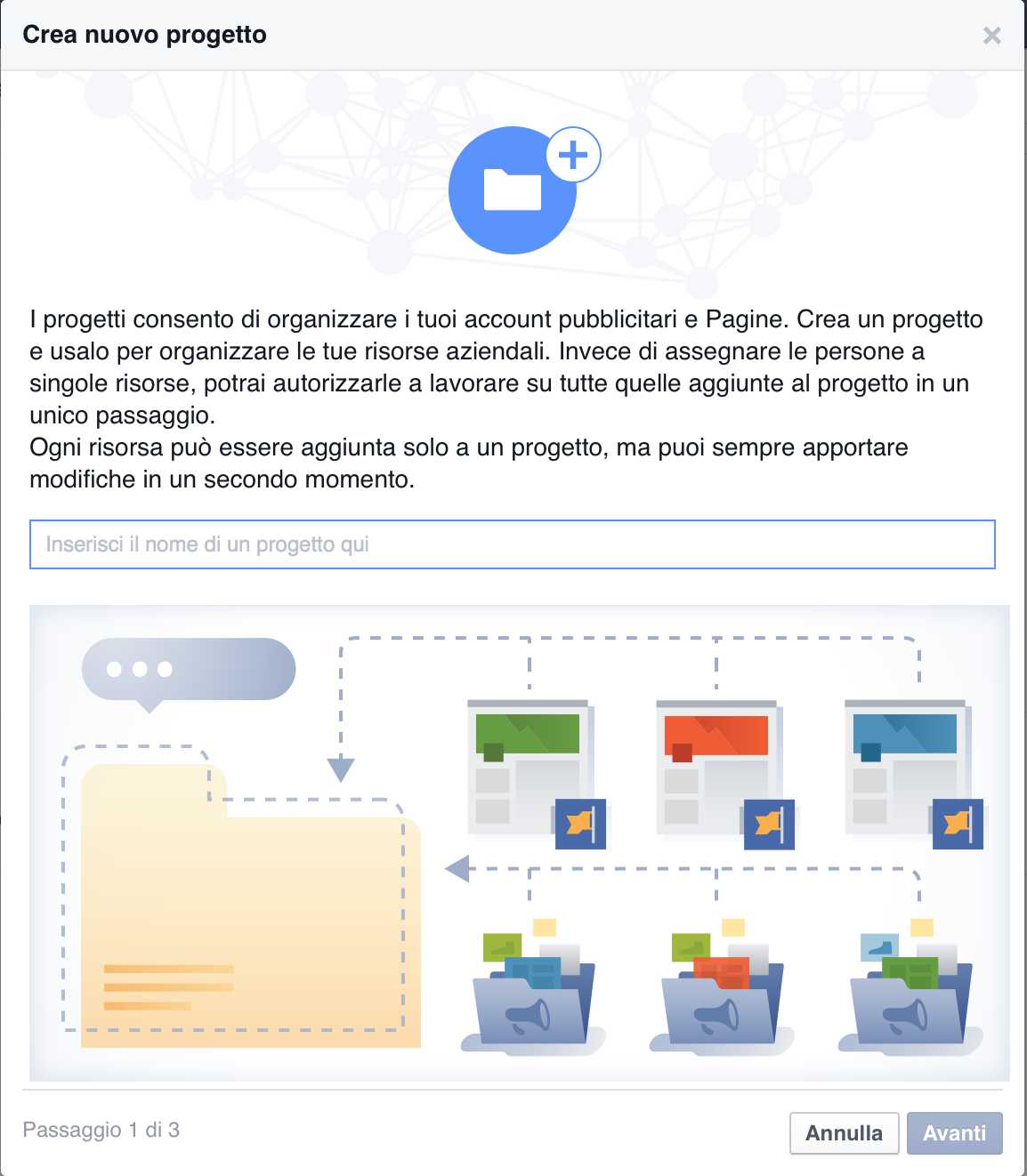 Non è obbligatorio creare progetti per organizzare le risorse. Possono però essere uno strumento utile se le risorse da gestire sono tante: creando progetti è possibile, usando i filtri di Facebook Business Manager, fare che siano mostrate soltanto quelle di un determinato progetto.