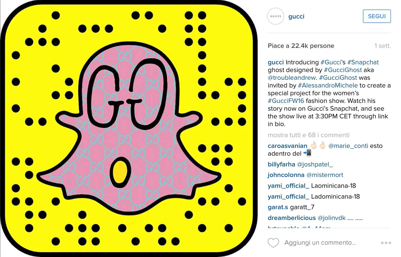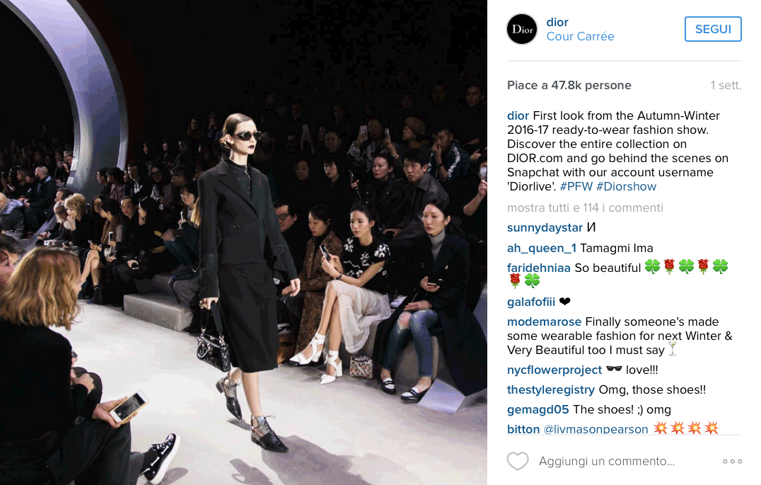 Al primo posto troviamo Gucci e Roberto Cavalli, che hanno seguito le orme di Burberry dello scorso #fashionshow, in cui si dava appuntamento su Snapchat per guardare la sfilata; a seguire Dolce & Gabbana e Dior che hanno deciso di utilizzare quel particolare canale per mostrare il backstage. In più il brand italiano di Stefano e Domenico ha postato sugli altri social in realtime foto in una nuova modalità, ovvero scattate da una prospettiva diversa, come se chi le vedesse fosse seduto in prima fila in mezzo ad altri esperti del settore.