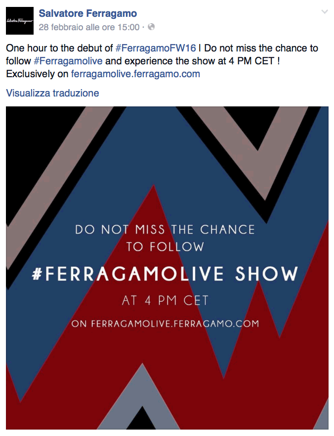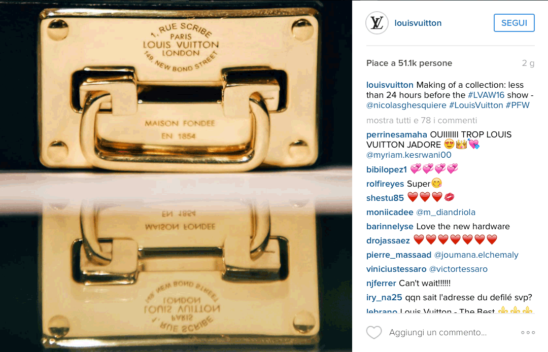 D’altra parte, alcuni brand italiani e francesi hanno saputo accattivare i propri follower, permettendo loro di seguire la sfilata anche da casa. Ciò è avvenuto alla MilanFashionWeek, dove molti brand italiani tra cui Armani, Moschino e Ferragamo, sui social hanno esteso l’invito al fashion show a tutti gli utenti attraverso il livestreaming sul sito ufficiale del brand. Anche Louis Vuitton, poche ore prima dell’inizio dell’evento, ha mostrato la scenografia invitando gli utenti a seguire il live sul sito ufficiale. In più, LV ha preparato il suo pubblico condividendo il “making of” il giorno prima della sfilata attraverso foto professionali che mettessero in luce il marchio, riprendendo in dettaglio il logo e i materiali.