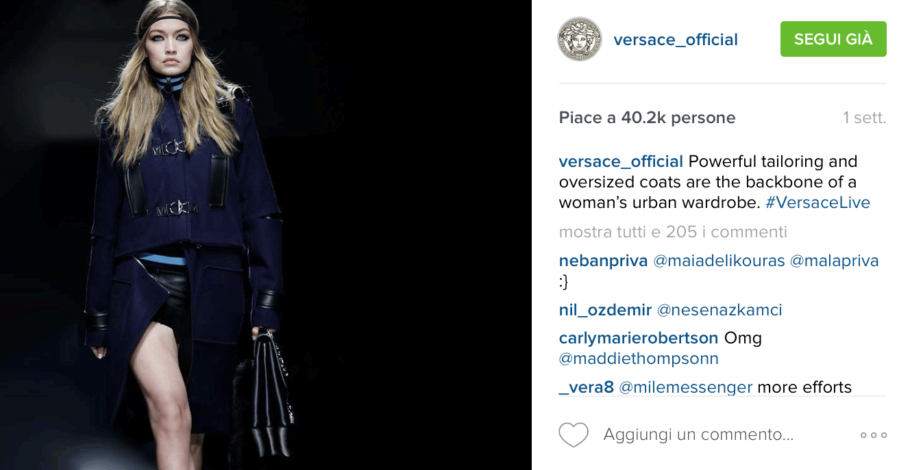 L’idea geniale condivisa da Fendi e Versace è stata quella di introdurre nelle sfilate modelle molto apprezzate sui social. Kendall Jenner, che ha aperto la sfilata di Fendi, è una modella molto seguita dagli utenti: la sua foto ha raggiunto 38.3mila like su Instagram e ha portato un aumento evidente di follower all’account del brand. Lo stesso ha fatto Versace con la modella Gigi Hadid, già testimonial del brand e amica della Jenner, raggiungendo 40,2mila like.