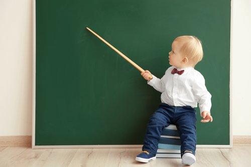 Cute little boy with pointer sitting on pile of books near blackboard