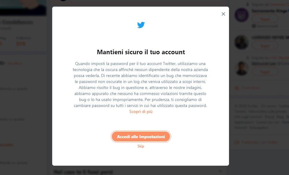 Twitter invita quindi a cambiare password tramite una finestra pop up che appare a inizio navigazione, spiega la natura del bug e i collegamenti alla pagina delle impostazioni per la modifica della password. Twitter suggerisce anche di adoperare i conseuti metodi per rafforzare la sicurezza online, come la doppia autenticazione, la scelta di password univoche per ogni servizio e l’utilizzo di un’app di gestione di password per organizzarle correttamente.