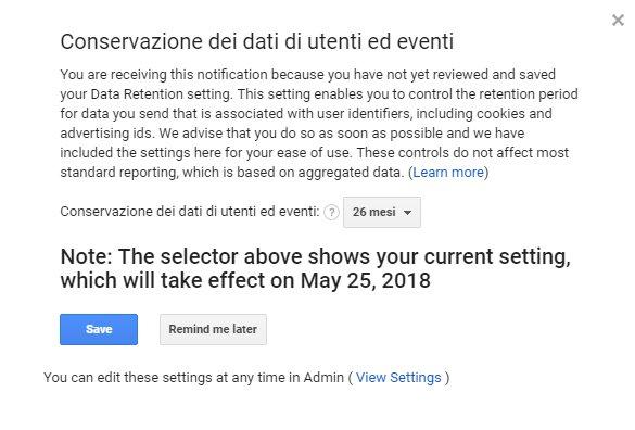 Puoi scegliere per quanto tempo Analytics deve conservare i dati prima di eliminarli automaticamente: