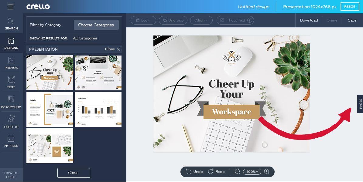 Per cominciare a creare il tuo design multi-pagina, ti basta accedere a Crello (anche tramite Facebook) e selezionare il formato “Presentazione” dalla schermata iniziale.