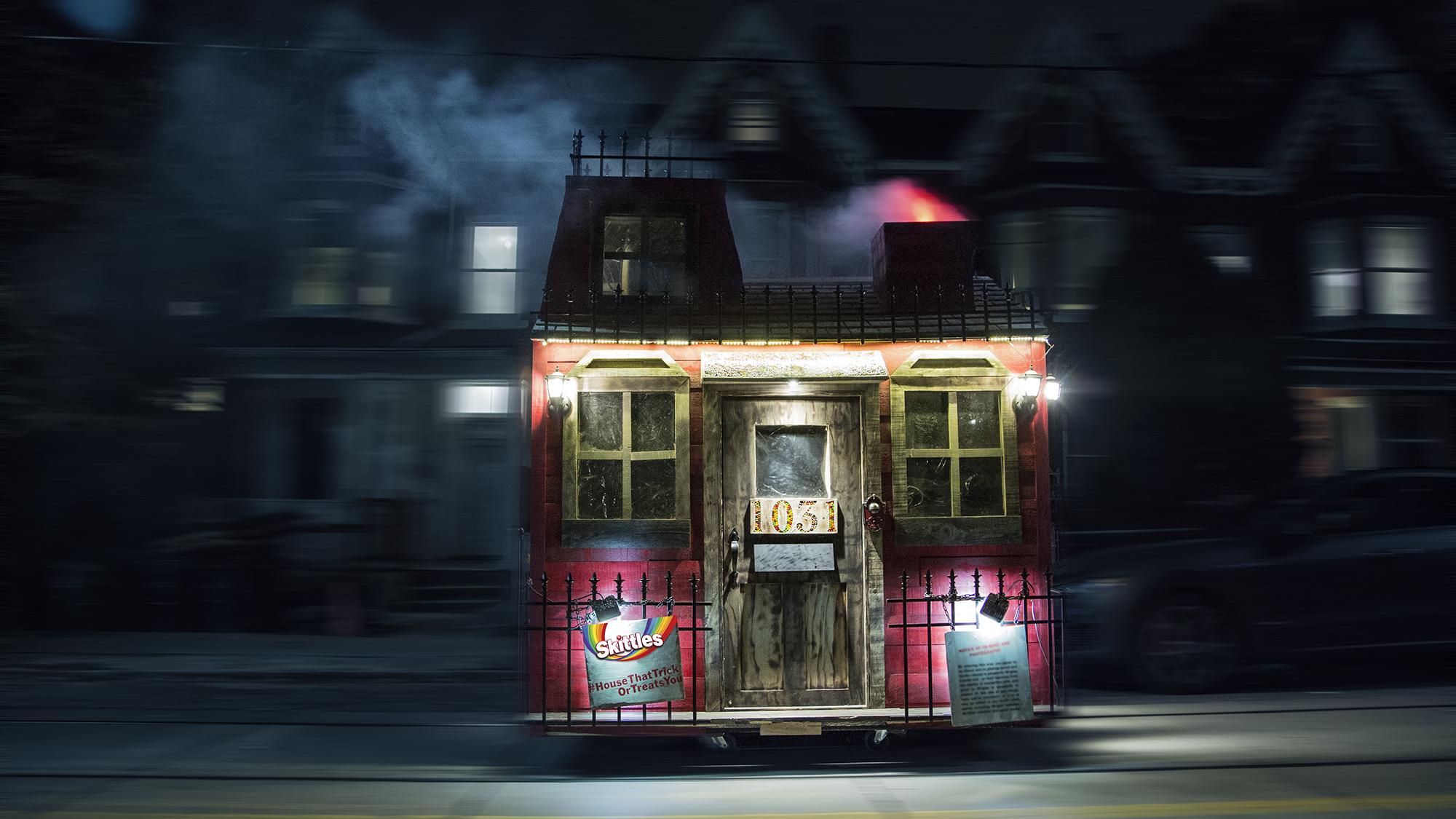 Non è un vero e proprio annuncio stampa perché si tratta di una campagna di ambient marketing di Skittles: se non andrai in giro per fare dolcetto o scherzetto nella notte più spaventosa dell'anno, magari sarà una casa stregata a venire di corsa da te.