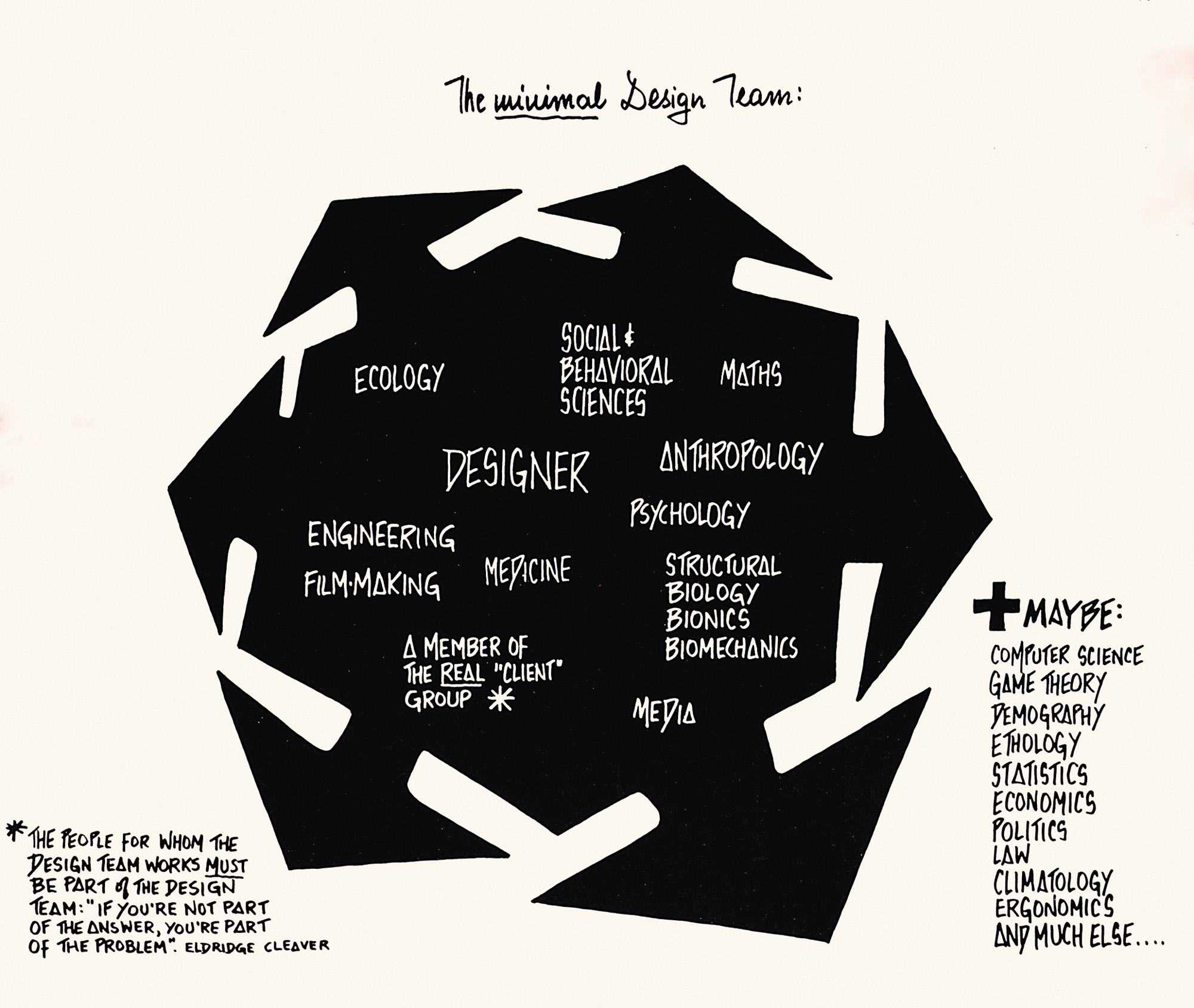 Papanek sosteneva che il design va oltre il singolo oggetto: è un processo, qualcosa che circonda tutti noi e che tocca ogni elemento del mondo reale, un sistema che va a interagire con molteplici discipline. D’altronde, è proprio sua la teoria che il buon design non sia l’effetto del pensiero di una singola persona, bensì di un gruppo di lavoro che al suo interno raccoglie specializzazioni differenti. Il design diventa così olistico, totale, e allo stesso tempo rispettoso dell’uomo e dell’ambiente, in grado di far sì che tutto sia connesso.