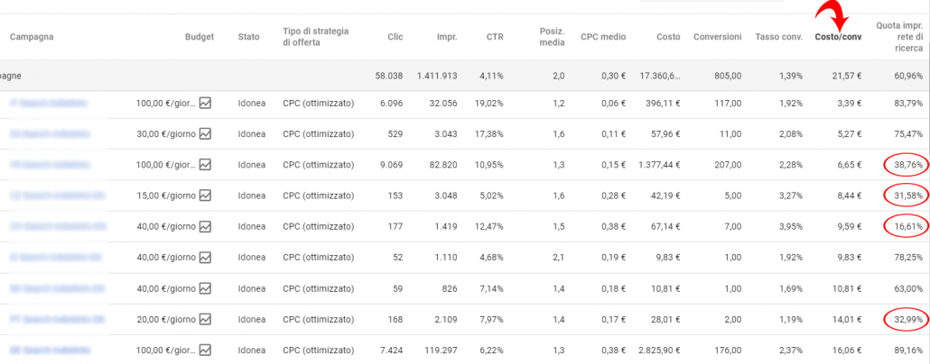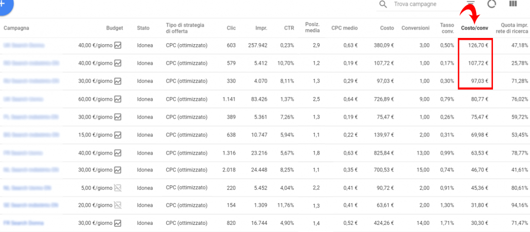 • i CPC non sono impostati correttamente (gli elementi a bassa conversione stanno drenando il budget che dovrebbe andare invece a quelli migliori).