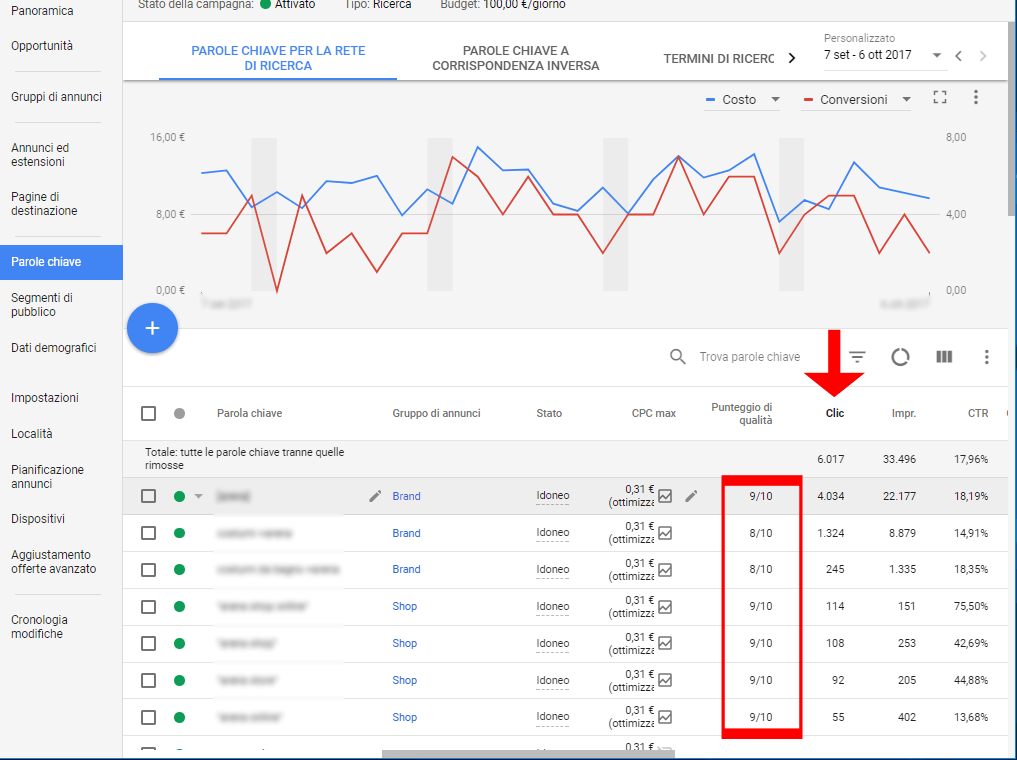 Se la maggior parte delle parole chiave su cui spendiamo di più ha un Quality Score compreso tra 8 e 10, hai un account strutturato abbastanza bene (agli occhi di Google). Più bassi sono i punteggi, più cambiamenti saranno necessari per ottimizzarlo.