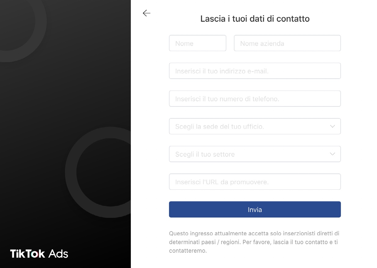 Come avrete certamente intuito fare pubblicità su TikTok non è ancora facile come potrebbe essere su Facebook o Instagram. Se avete un azienda e volete accedere a questa piattaforma quello che vi consiglio è di richiedere l’accesso mandando una email a questo indirizzo advertise@tiktok.com indicando che tipologia di business e idea di campagna avete.